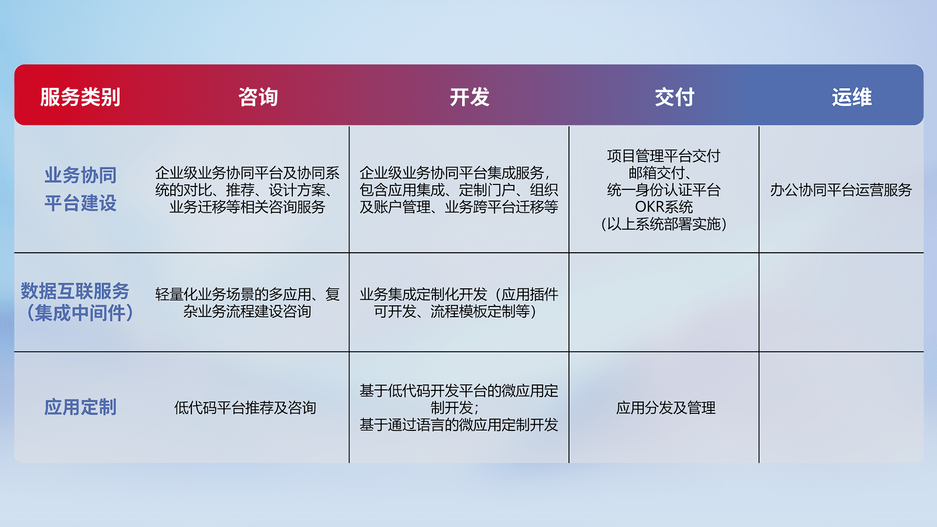 针对钉钉、、企微、、、IDaas等平台级产品提供产品的规划、、、、方案、、交付、、、、定制化开发等服务,,,,实现如统一协同办公、、、智能客户服务、、、、混合会议管理、、、、智能数据查询、、等业务场景,,,实现数字化转型。。。