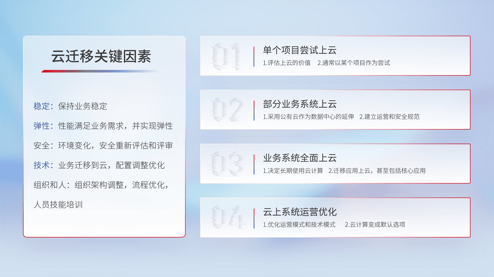 结合实际业务,,,从规划设计、、、云平台选型、、云原生改造、、、数据迁移、、、、集成交付,,,,迁移全过程为客户识别最佳上云路径,,做好风险识别管理,,,设计网络架构、、、、身份权限、、、、安全审计合规、、、操作审计、、日志审计、、监控告警策略、、、、多站点容灾设计等,,,,对云上基础设施进行整体规划,,,提升IT治理水平,,以满足弹性、、、高可用、、、高性能的需求。。
