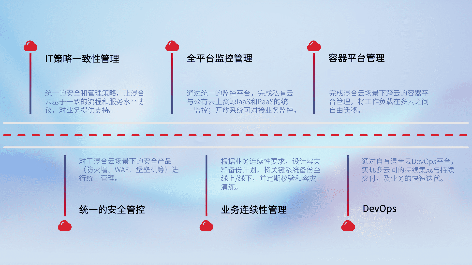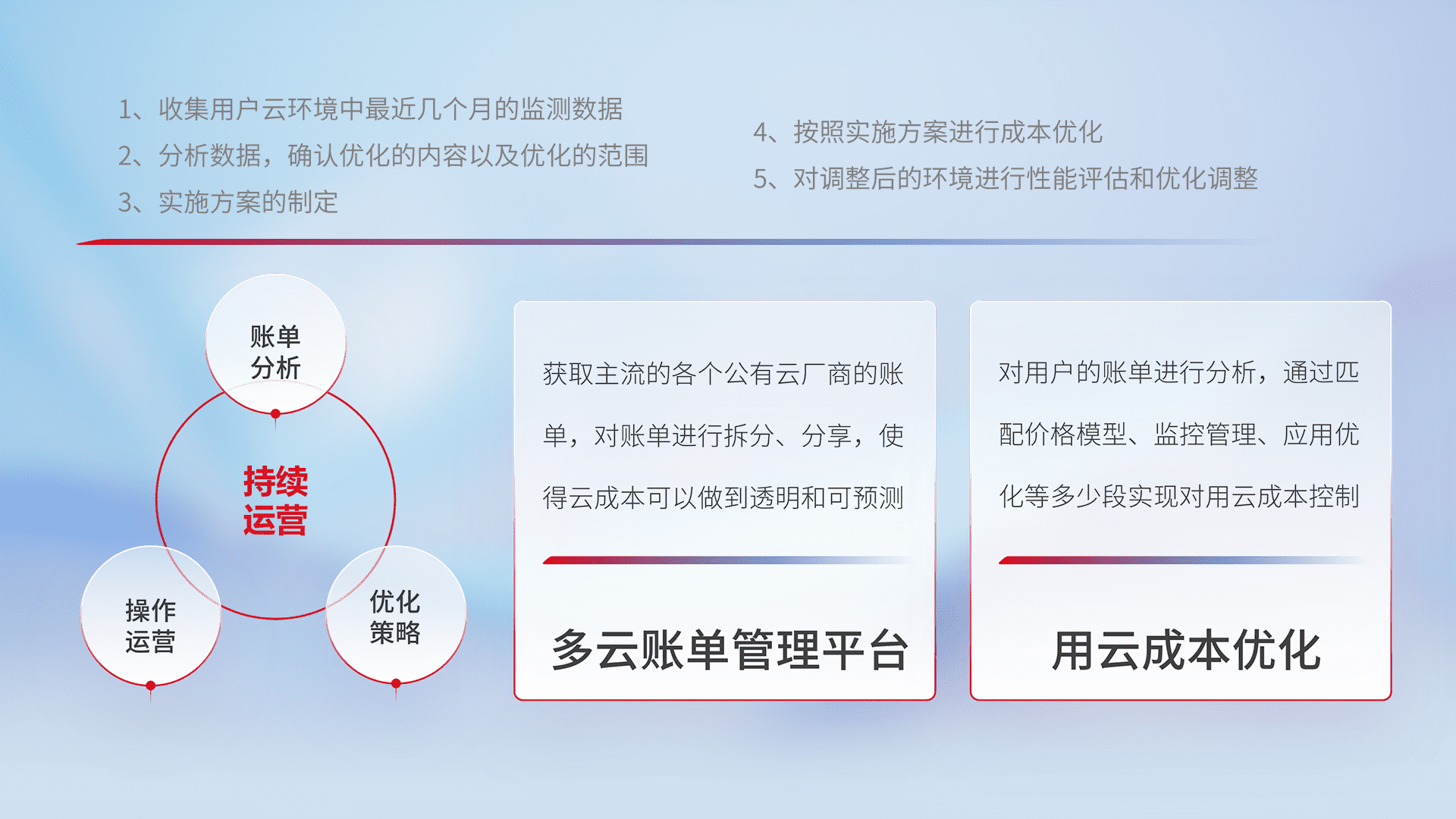 通过多云纳管,,,以统一的资源数据模型把客户的云资源进行抽象和封装,,,,进而实现对多云资源的统一操作,,,,保障云资源管理的可靠性、、、、稳定性与可用性。。。。量身定制化运维内容,,,,配置、、、、开发运维、、补丁管理、、、、备份、、、、监控、、、、认证和访问管理、、审计和日常巡检等,,保障在用云过程中的可靠度,,,,稳定度以及高可用率。。